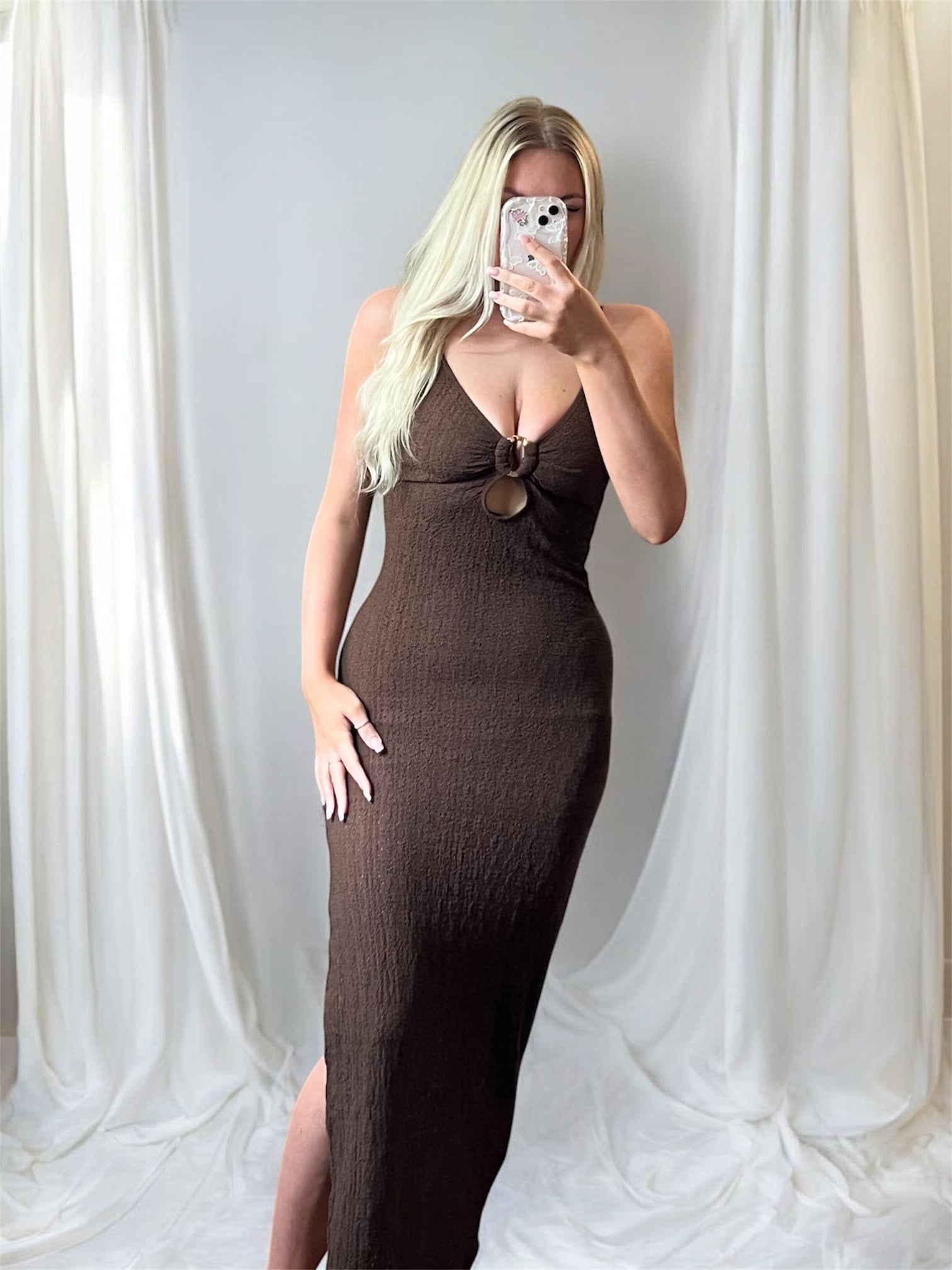 This Golden Ring Cut Out Cami Style Dress is perfect for your summer holiday with its figure-hugging fit and adjustable straps providing support for a braless look. Stay comfortable and stylish all day long.
